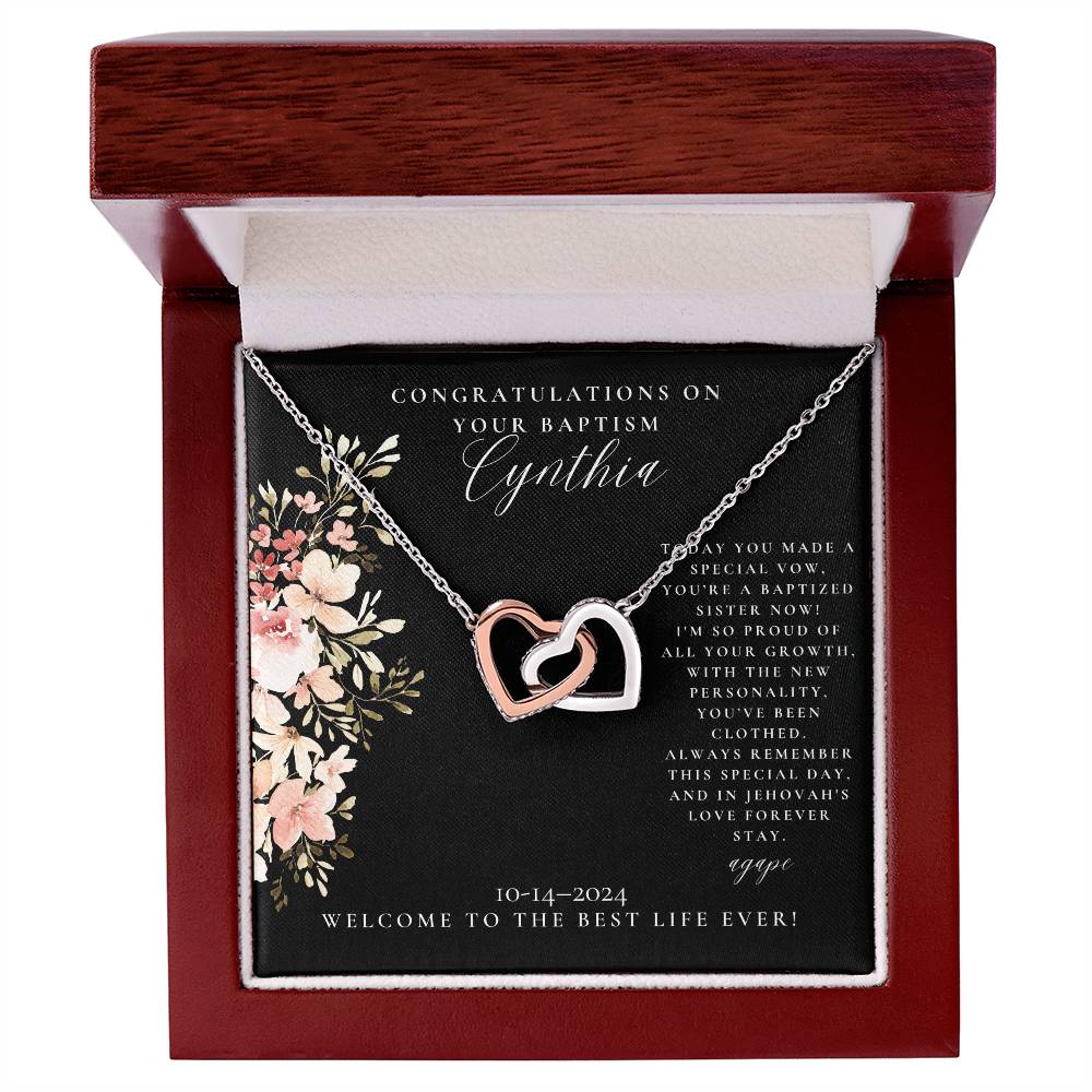 Looking for a baptism necklace for a new sister? The interlocking hearts necklace features two lovely hearts embellished with cubic zirconia crystals, this necklace is the perfect accessory for everyday wear, and is sure to become a favorite in her jewelry box. Beautifully crafted with a rose or yellow gold finish, it comes with the message card and box of your choosing. The poem is unique, written by us with love, and will add a special touch to your gift. You can also choose to use your own message in place of the poem by choosing the option at checkout.